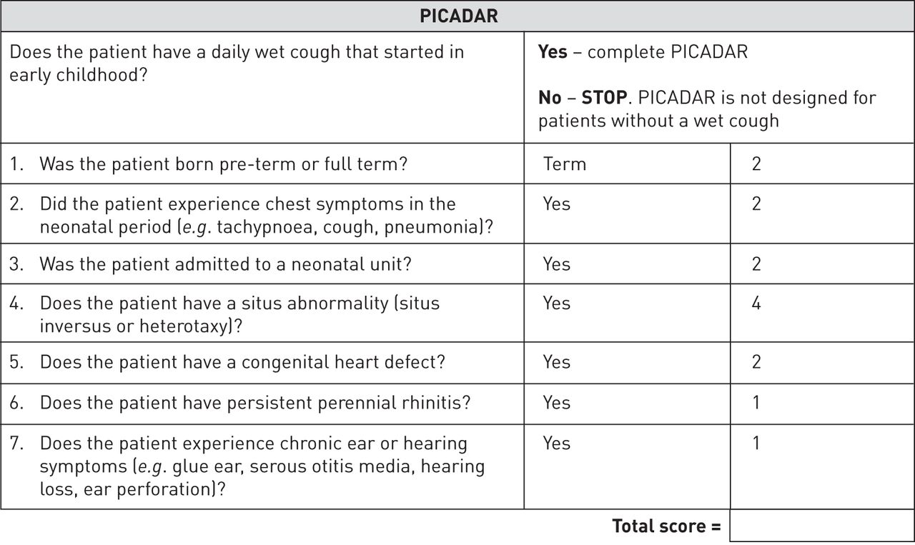 The PICADAR score evaluates seven clinical features in patients with persistent respiratory symptoms: